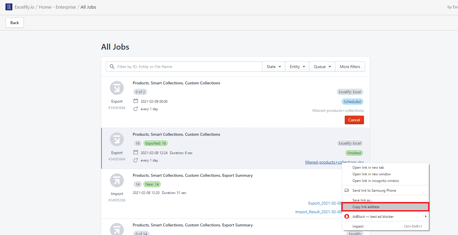 Open the “All Jobs” page and see that the export is done.