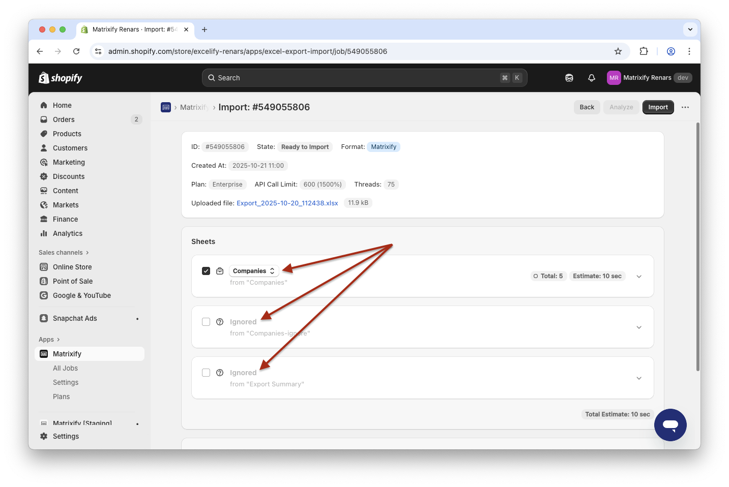 Once uploaded, the app will analyze the import file. After the app has analyzed the file, make sure that the edited Companies sheet has Companies