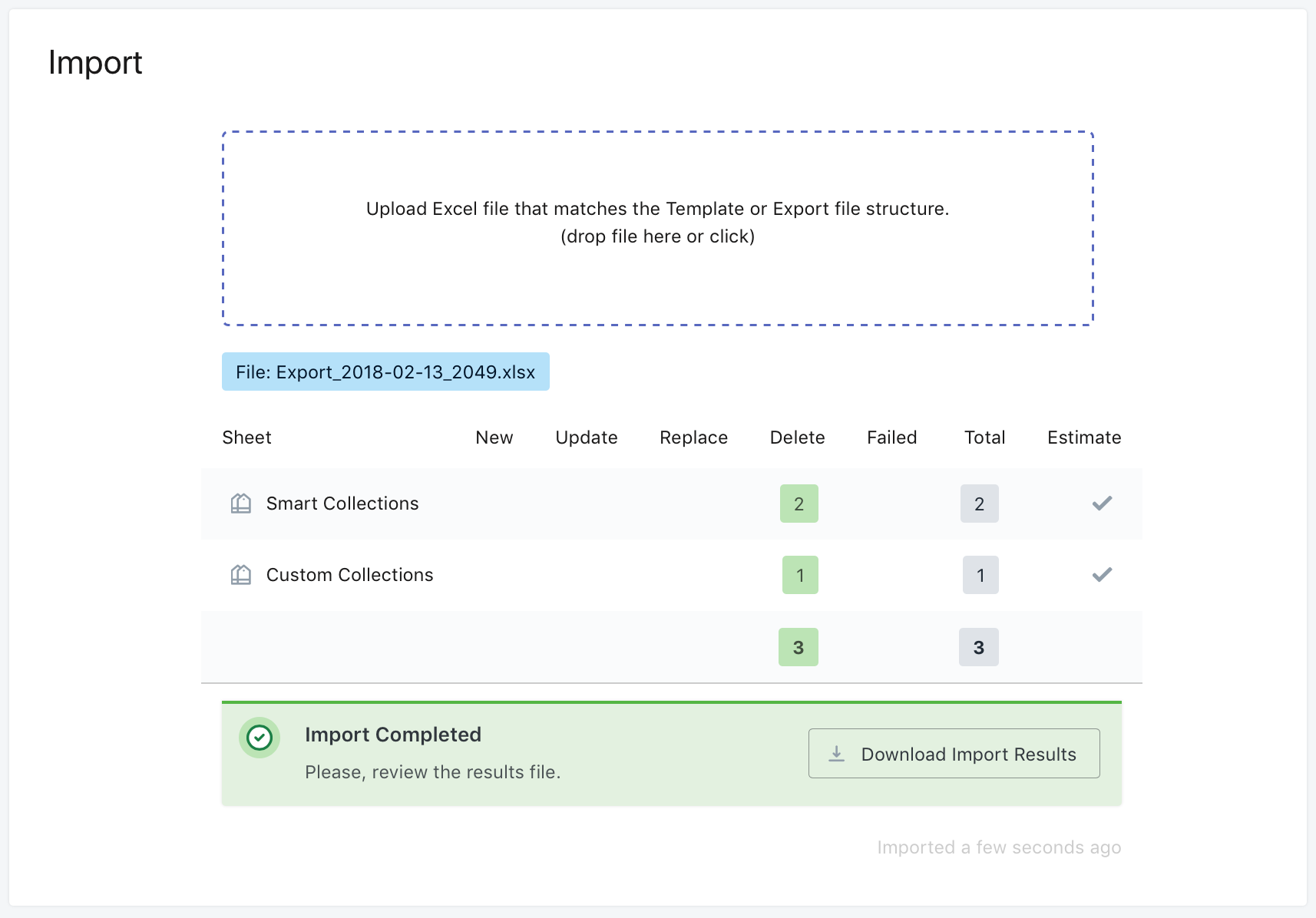 If all looks correct and the collections have been correctly recognised, you can go ahead and start the Import. If you see any Failed items, then after the import has finished, you can download the Import Results file and look into the “Import Comment” column. This column will tell you why that collection has failed to be deleted.