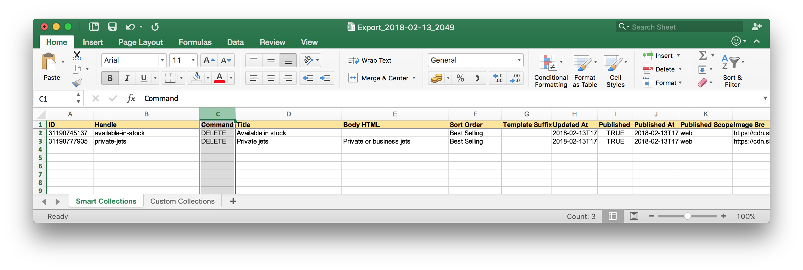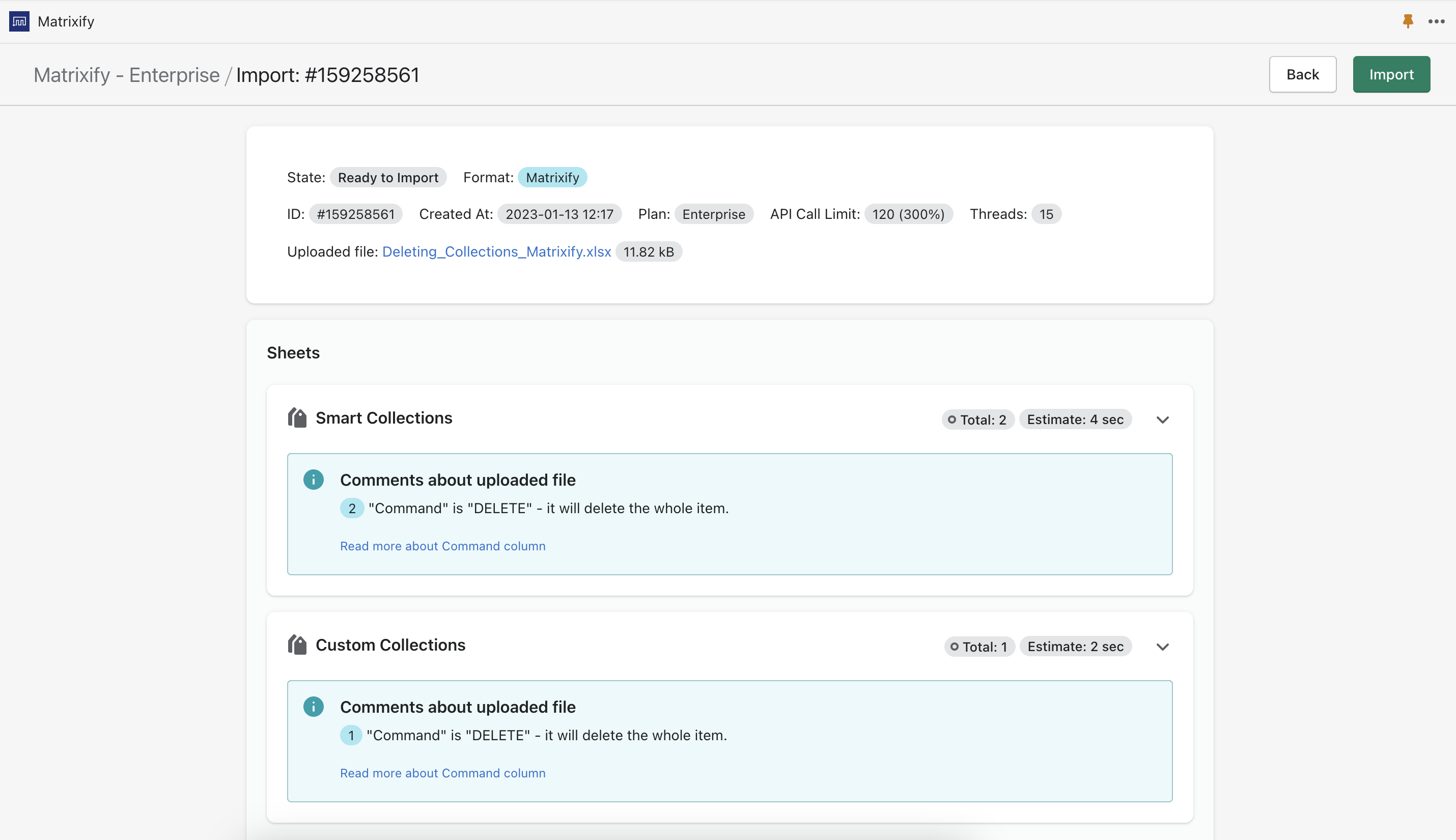 If you need to delete Collections of both kinds, pay attention, that there are two sheets in the Excel and add set the “Command” column to “DELETE” on both sheets.