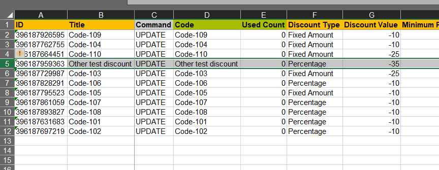Since in this case we only wish to disable Shopify Discounts then there is a lot of information that we do not need to update. So we can delete all the other columns that are not relevant to us here.