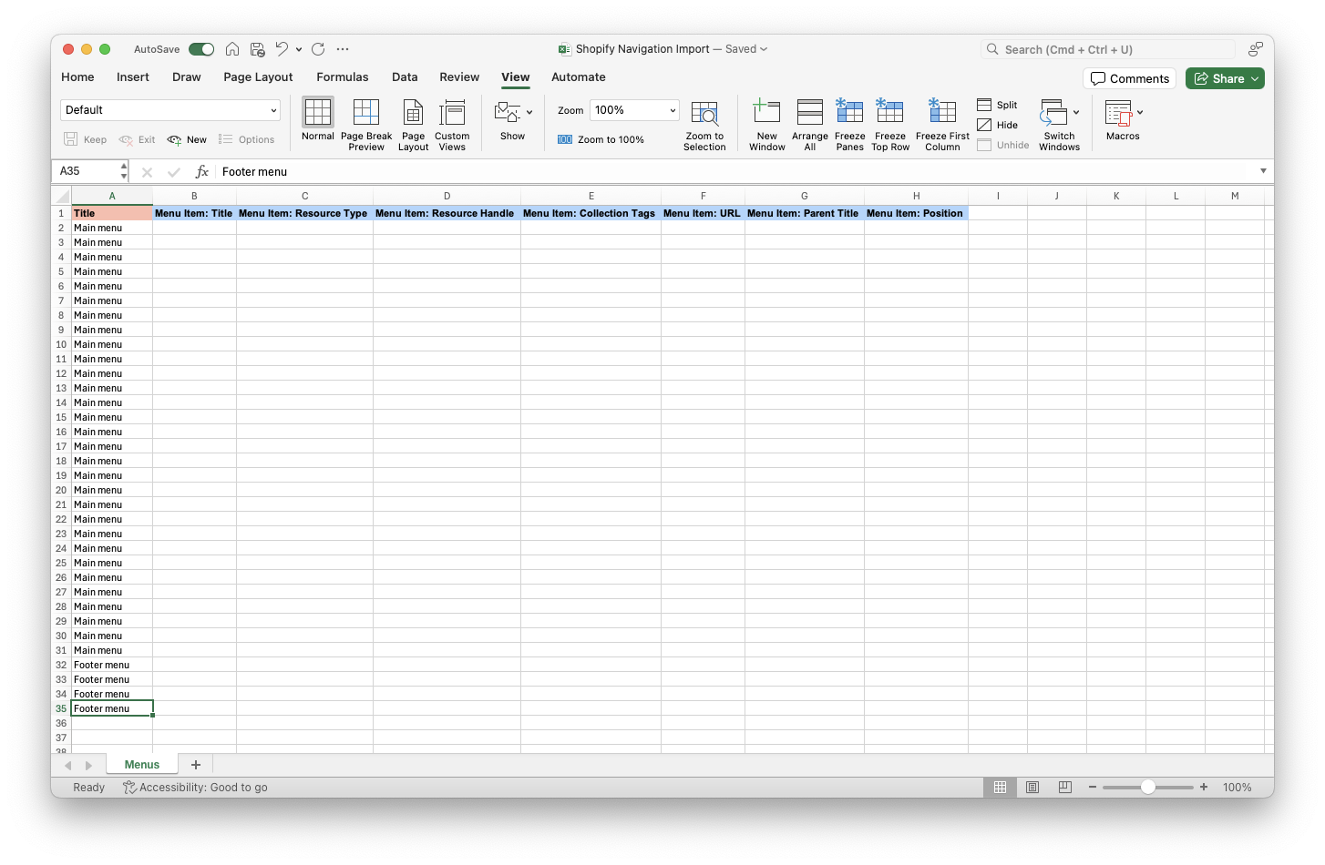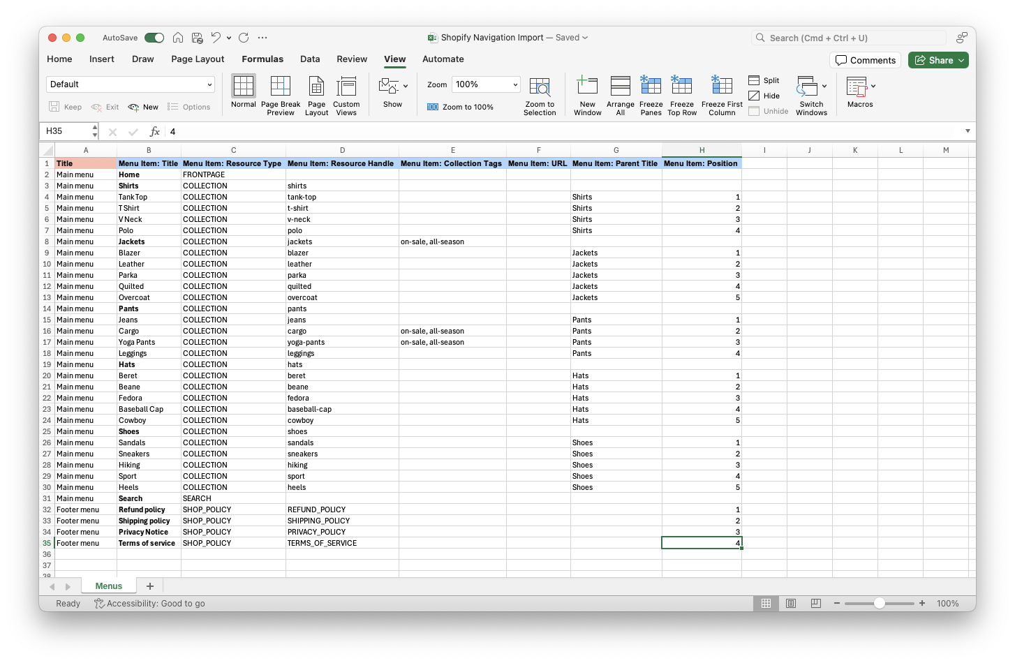 Now your file should be finished and contain all the required data to bulk create and import your Shopify Online Store Menus!
