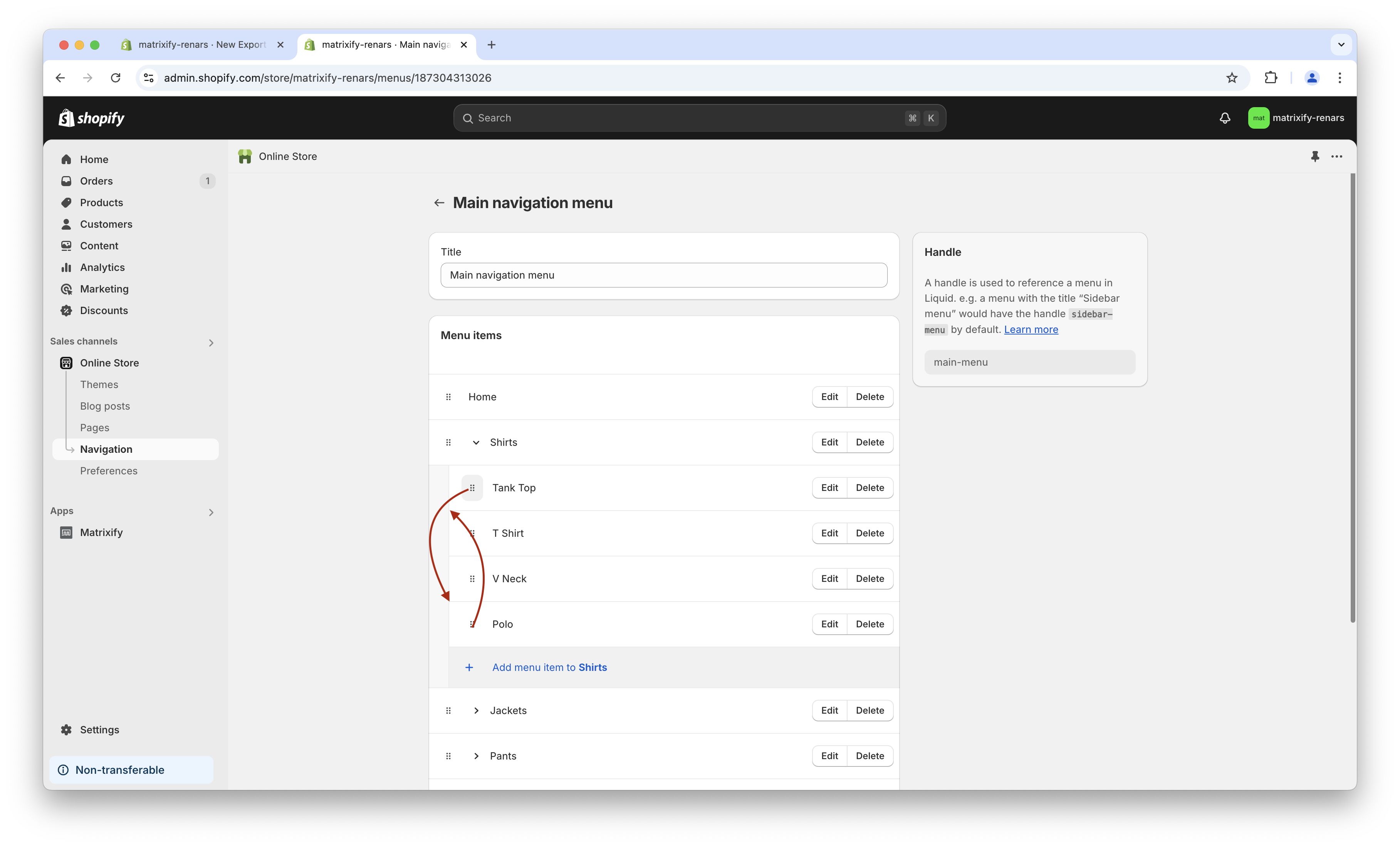 1 - Bulk export Shopify navigation menu item positions with Matrixify