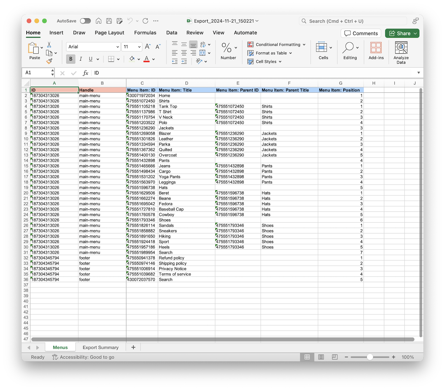 4 - Shopify menu item hierarchy exported in spreadsheet Excel file with Matrixify app