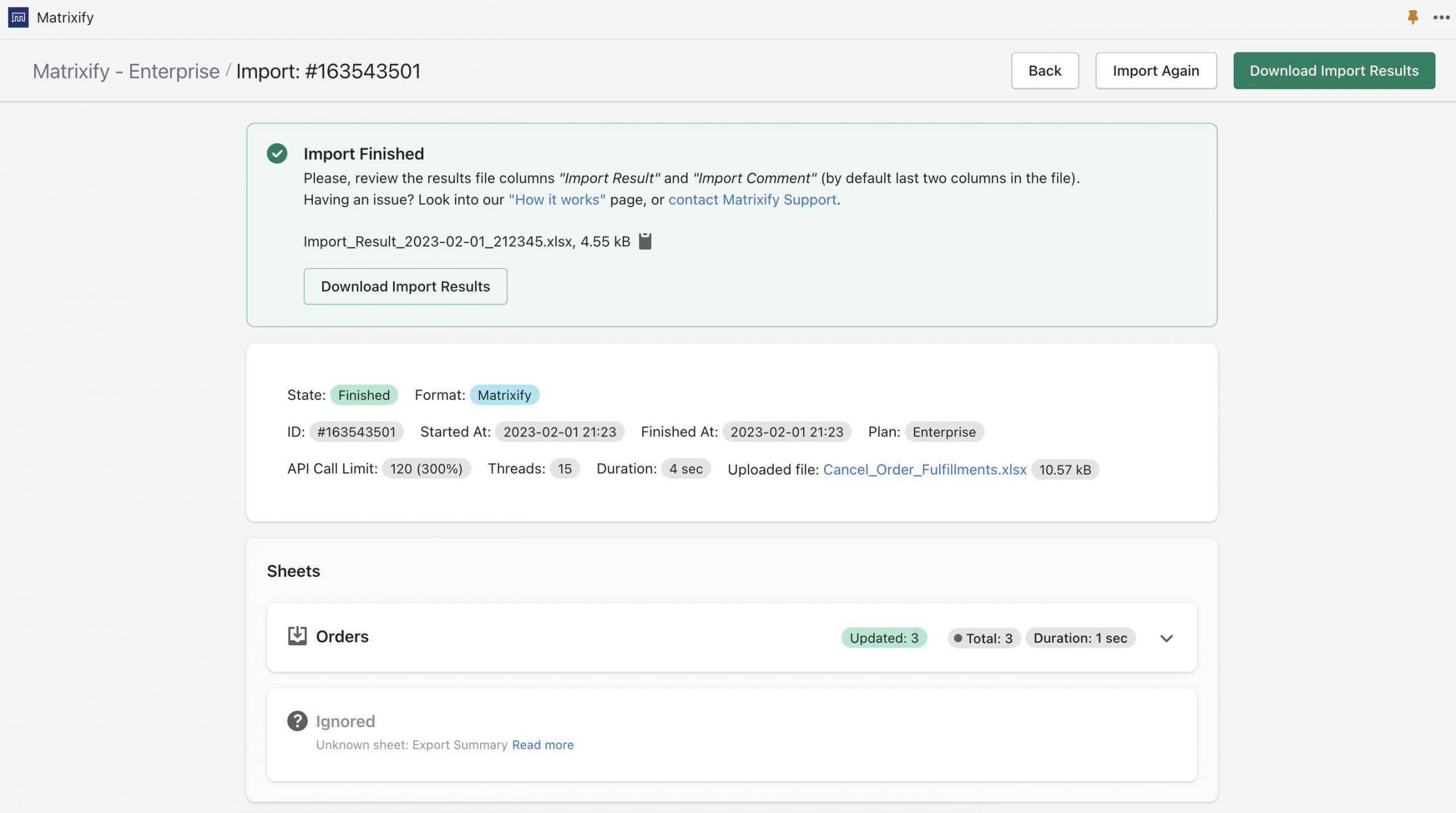 Check the results – all orders that were listed in your file are now marked as Unfulfilled. Meaning, that now your Fulfillments got cancelled!