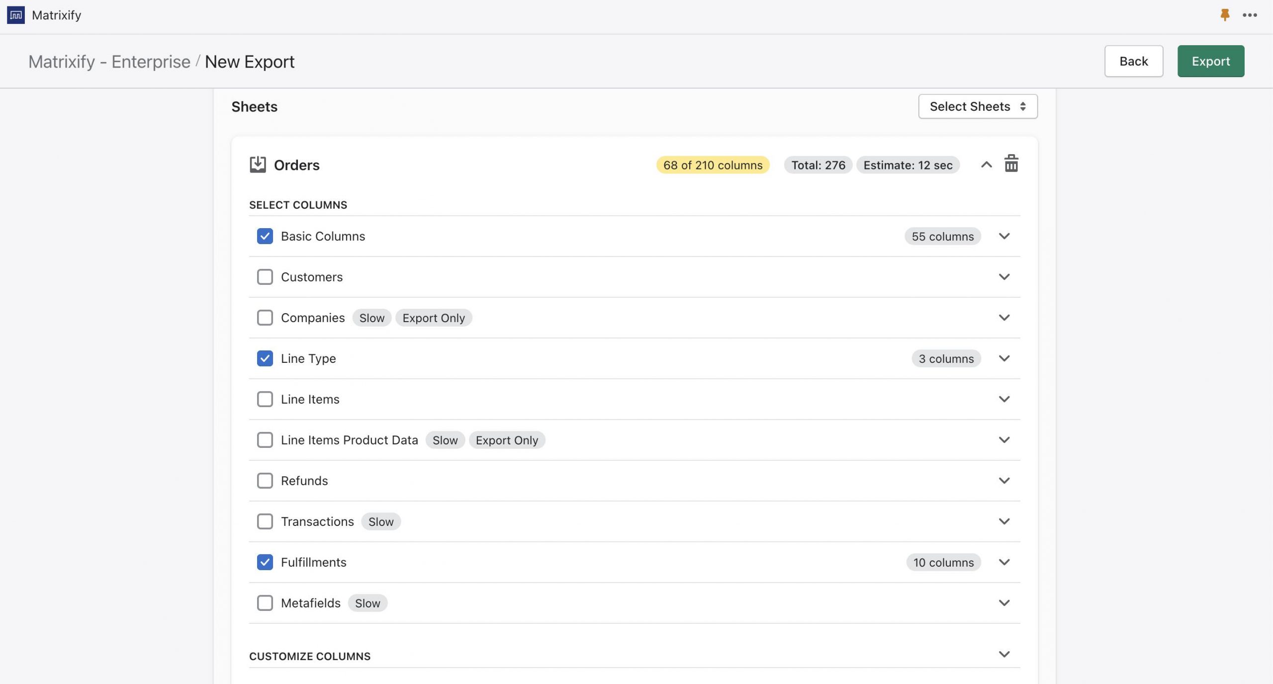 First, we must Export Orders with Fulfilment Status – Fulfilled. To do this you must go to the Matrixify app and select “New Export”. Once you have done this, select to Export “Orders” from the “Select Sheets” drop down and from there select to Export “Basic Columns” and “Fulfillments”. You can also add any filter we offer that you may need to Export only specific Orders.