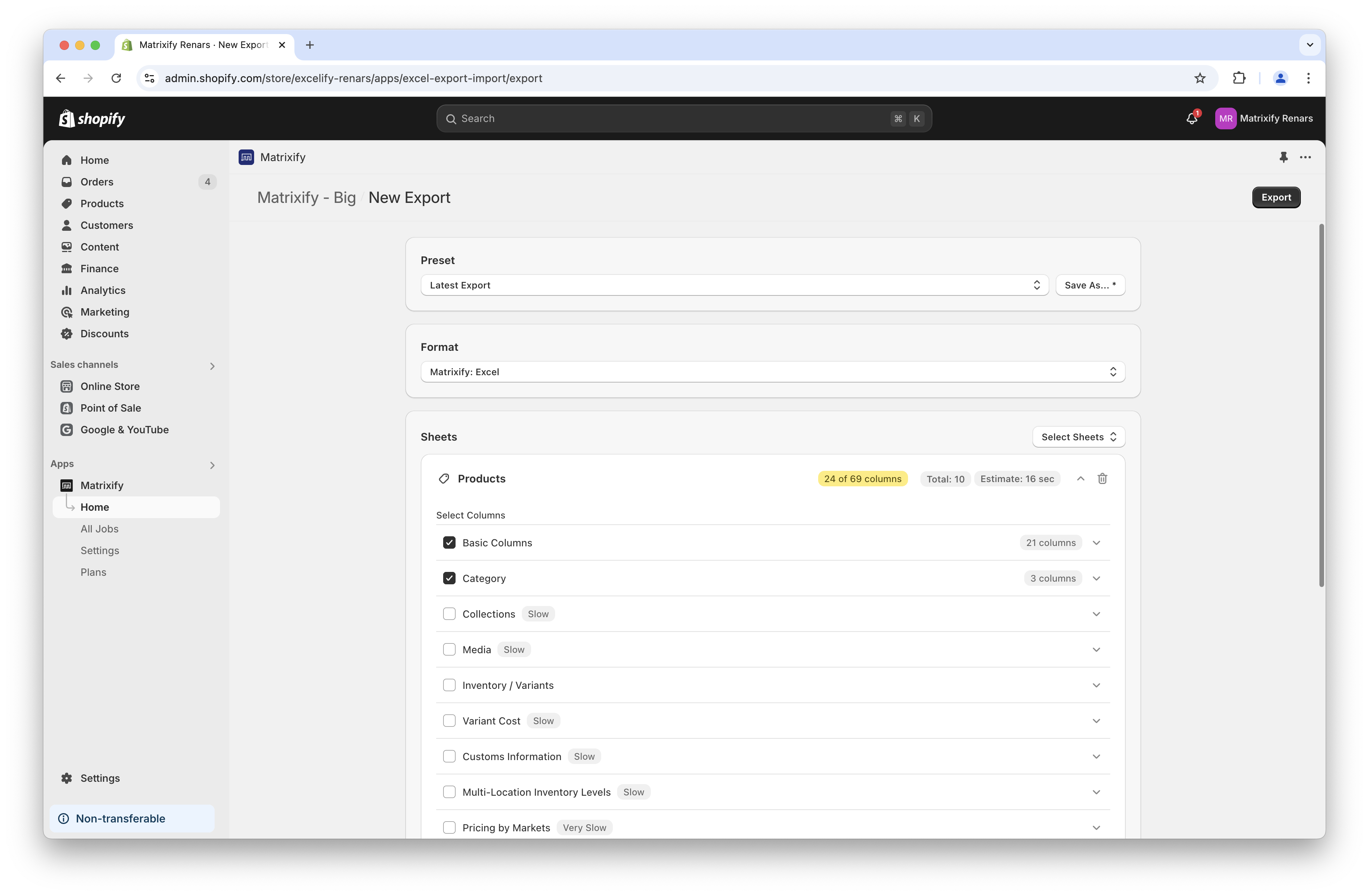 Select the export format as Matrixify: Excel. Then the app will be able to export data to Excel XLSX file which is a lot more user-friendly than the CSV files.
