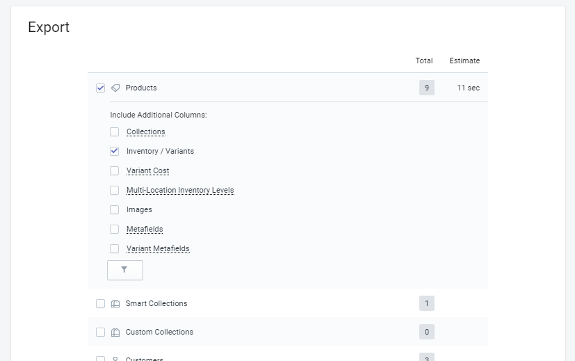 With Matrixify you can export all information for Products that Shopify allows us to take, but to update SKUs you don’t need everything so you can select only Inventory / Variants.