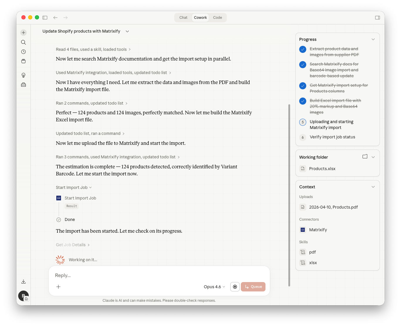 The Matrixify app does not need to be open in your store during this process, as Claude Cowork will connect to our servers and use the app in the background. But you can also open the app and see your latest and in-progress jobs to follow the process in the app.
