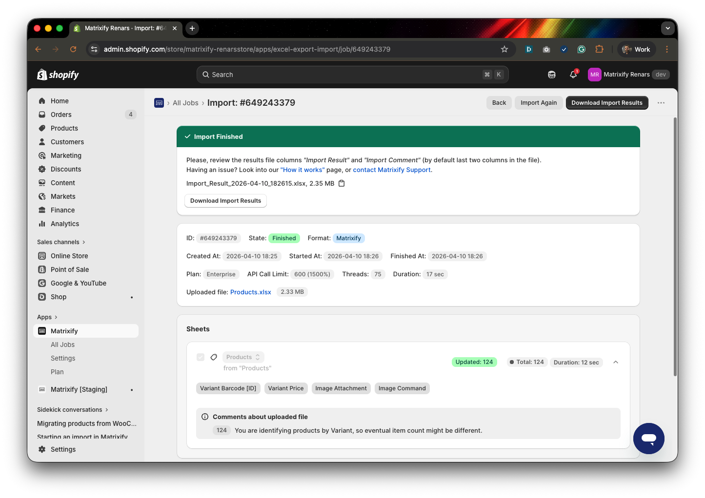 In the Matrixify app, you can locate the finished job that was performed by the Claude AI. The job summary shows how many Products were imported, along with any errors or warnings. If anything didn’t import as expected, you can download the results file directly from the app for a detailed row-by-row breakdown. Usually, errors and warnings would already be caught by the Claude AI as it follows the import progress.