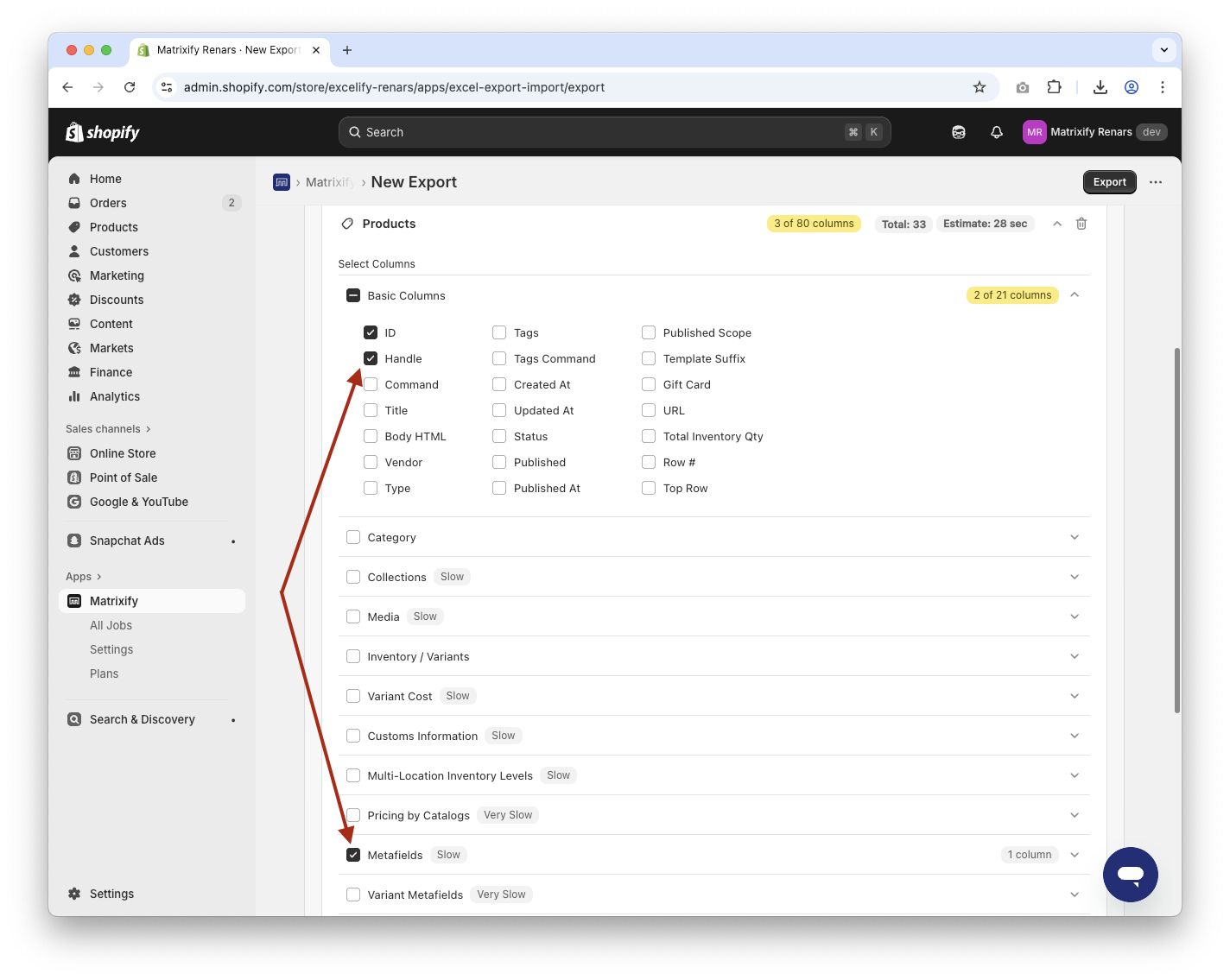 IDandHandlefromBasic Columnscolumn groupMetafields