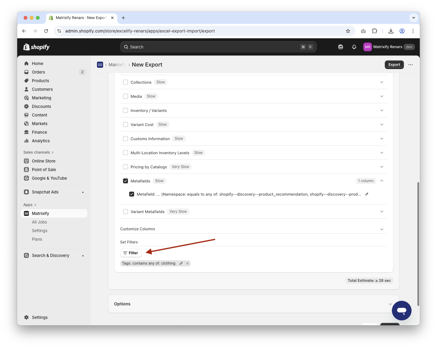 You can also click on the Filters button to apply filters to your Matrixify export and limit what Products are exported.