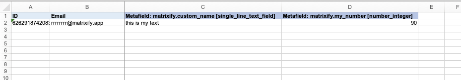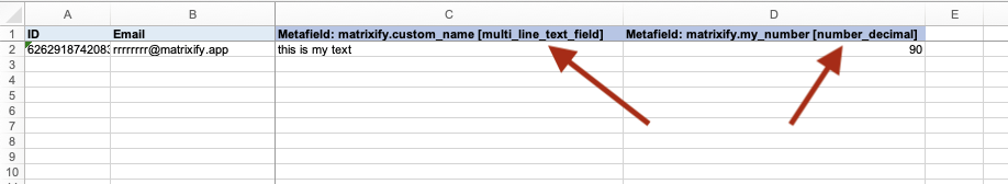 In your file you will see one row for each customer and Metafield columns that start with text “Metafield:”.