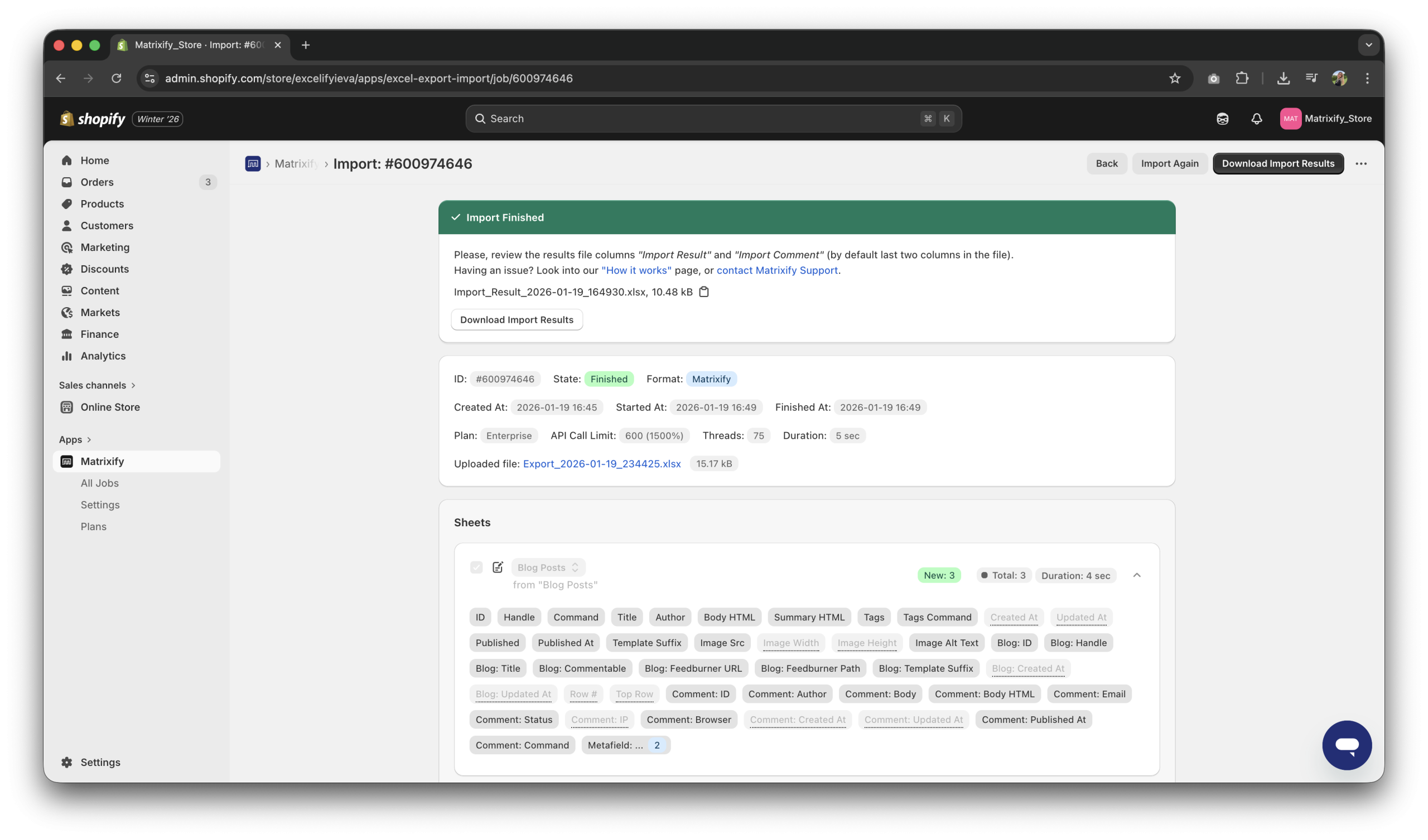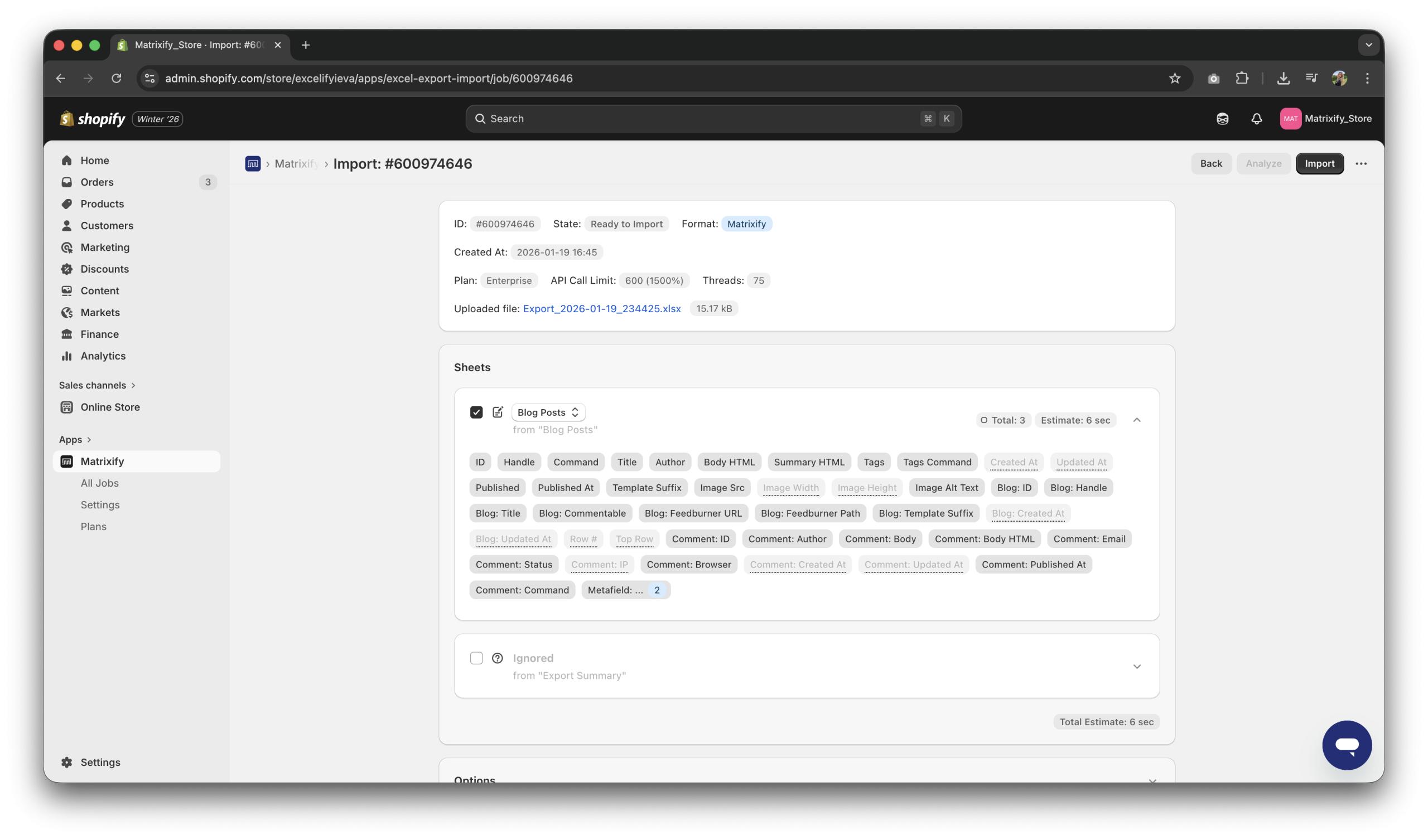 Open the Matrixify app in the Shopify store you would like your Blog Posts to be imported and in the Import section upload your previously exported Blog Posts file. The app will then analyze your file, recognising it as Blog Posts as well as recognising the Blog Post count in your file and columns it contains.