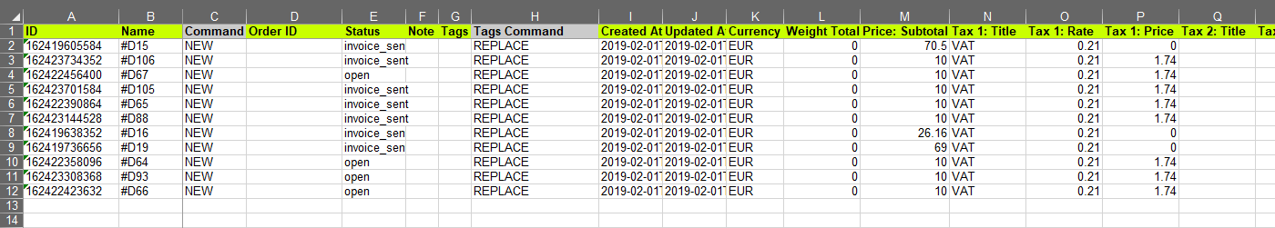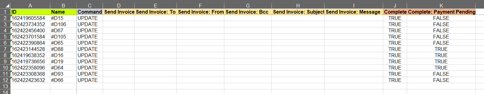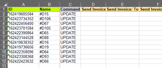 The first thing you would need to update is the “Command” column. Here you would need a value UPDATE to tell the app that you wish to update this Draft Order so we will do this for all Draft Orders in this file.