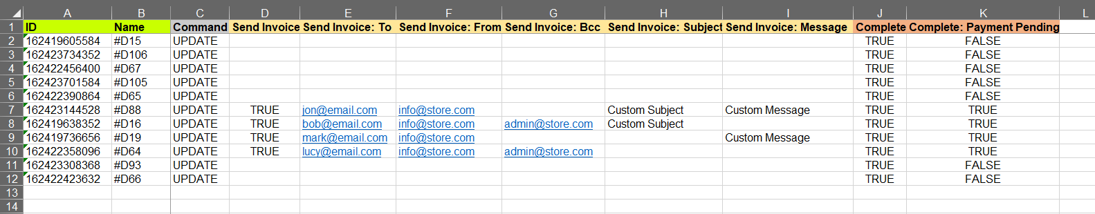 - You may also include Send Invoice: … columns if you wish to send invoices for these Draft Orders.