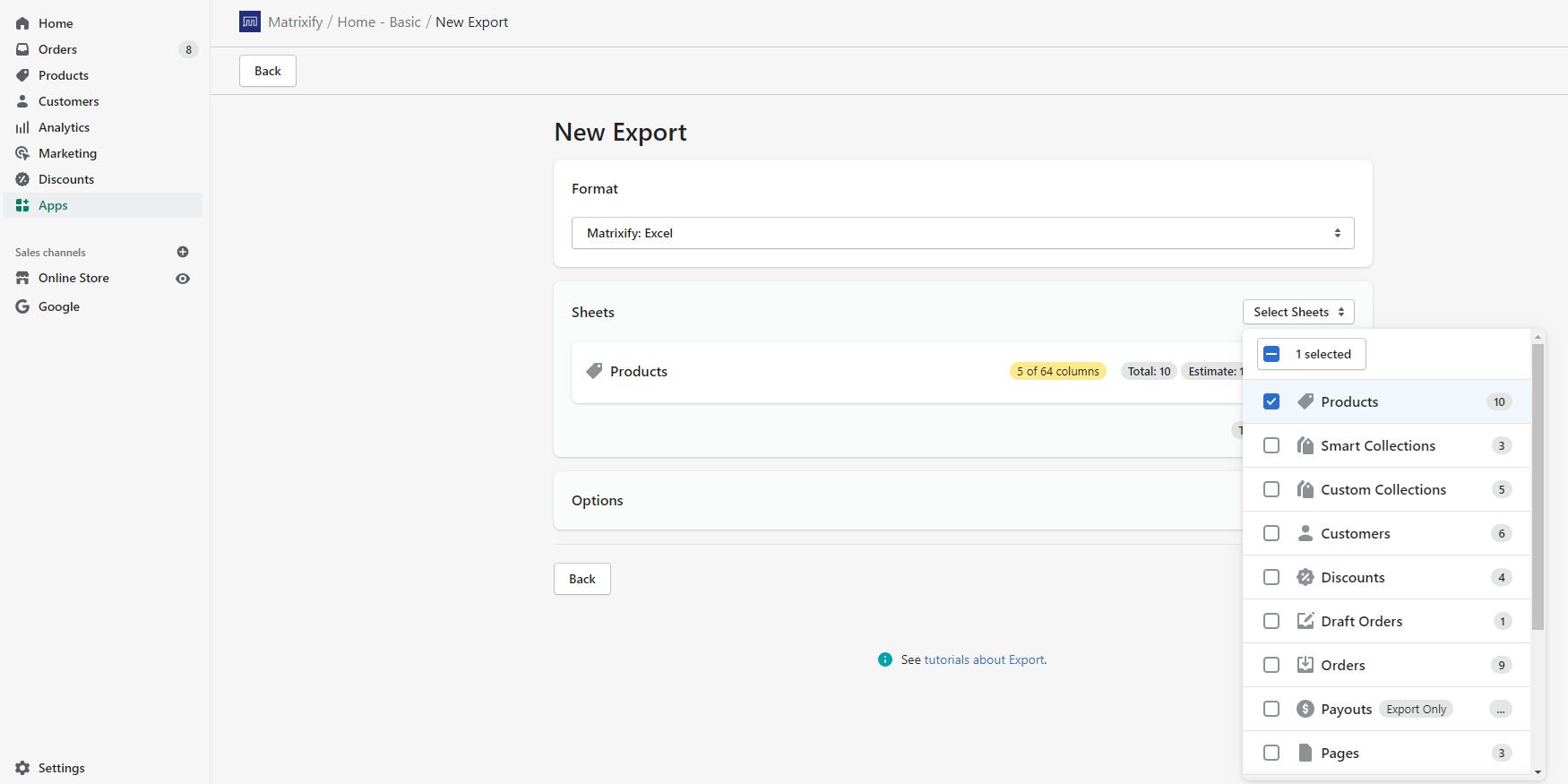 In the next “Sheets” section, you can select sheets of what to export, for example, I will select to export the Shopify Products.