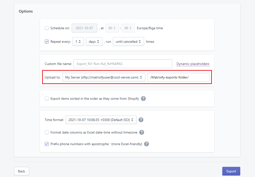 - Apply export Options to automatically repeat export and upload to SFTP server.