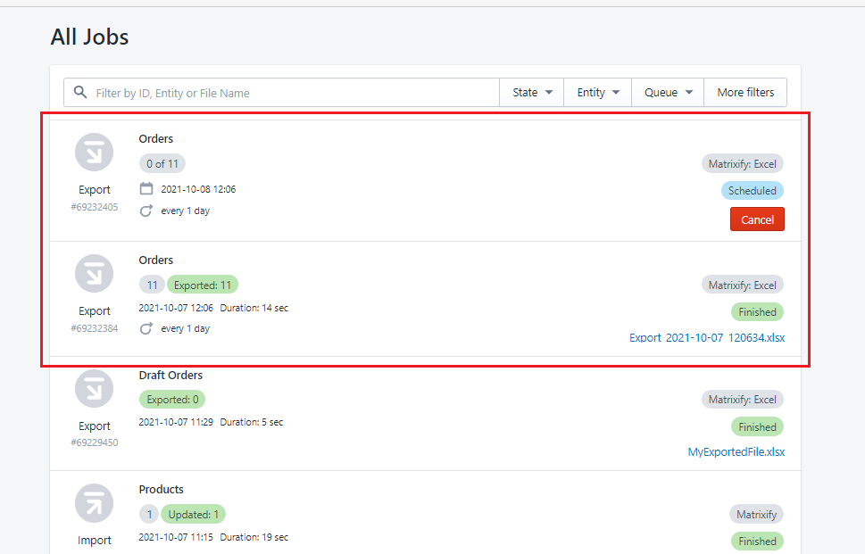 In the apps All Jobs page you can see all your past, running, and scheduled import and export jobs.