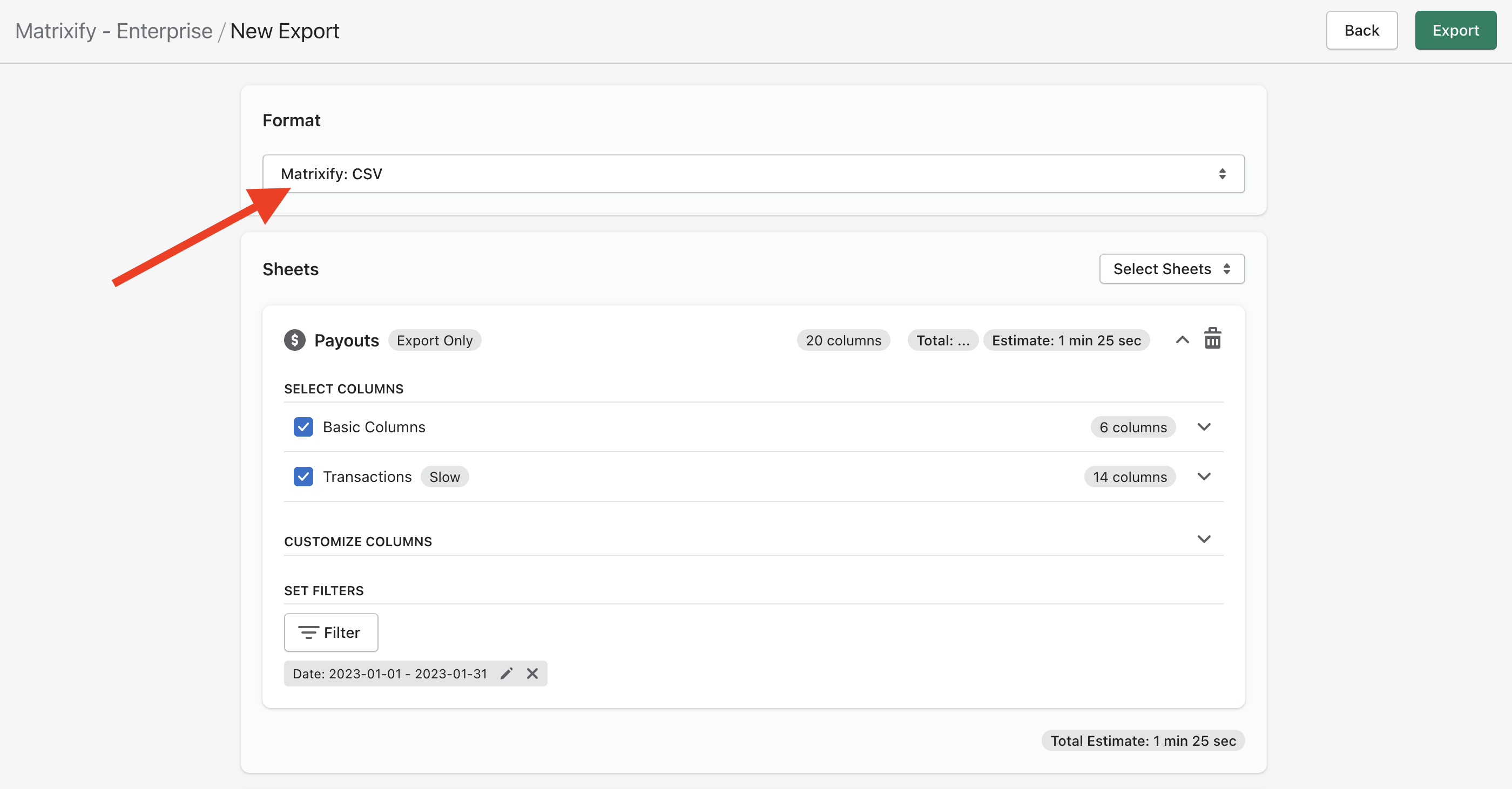 Choose the format to be “Matrixify: CSV” to generate export as a CSV file to be imported into Google Sheets automatically.