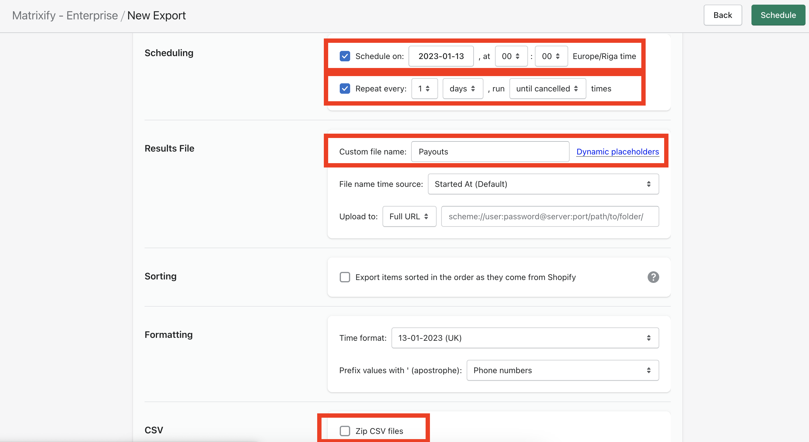 - Set the “Custom file name” so that each time the export runs, it generates the data in the same URL.