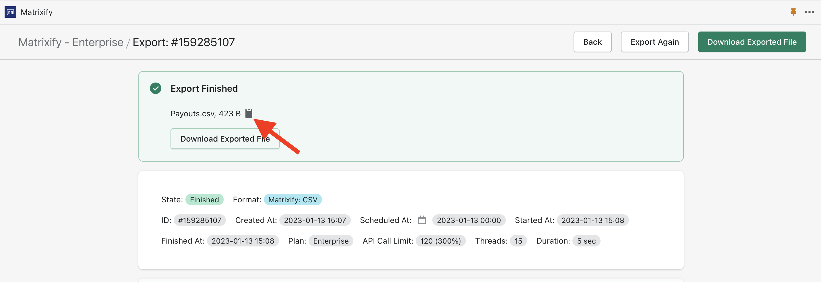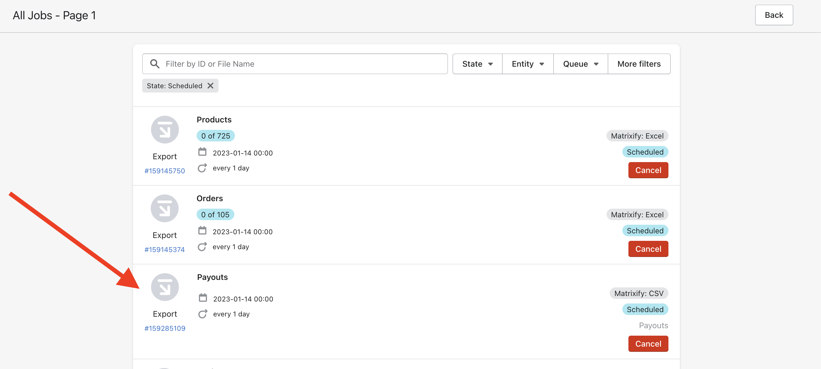 Then go to the “All Jobs” page and find the finished export to “payouts”. If it’s not yet finished, wait a bit, it should be done within 1-2 minutes depending on how large are your payouts.