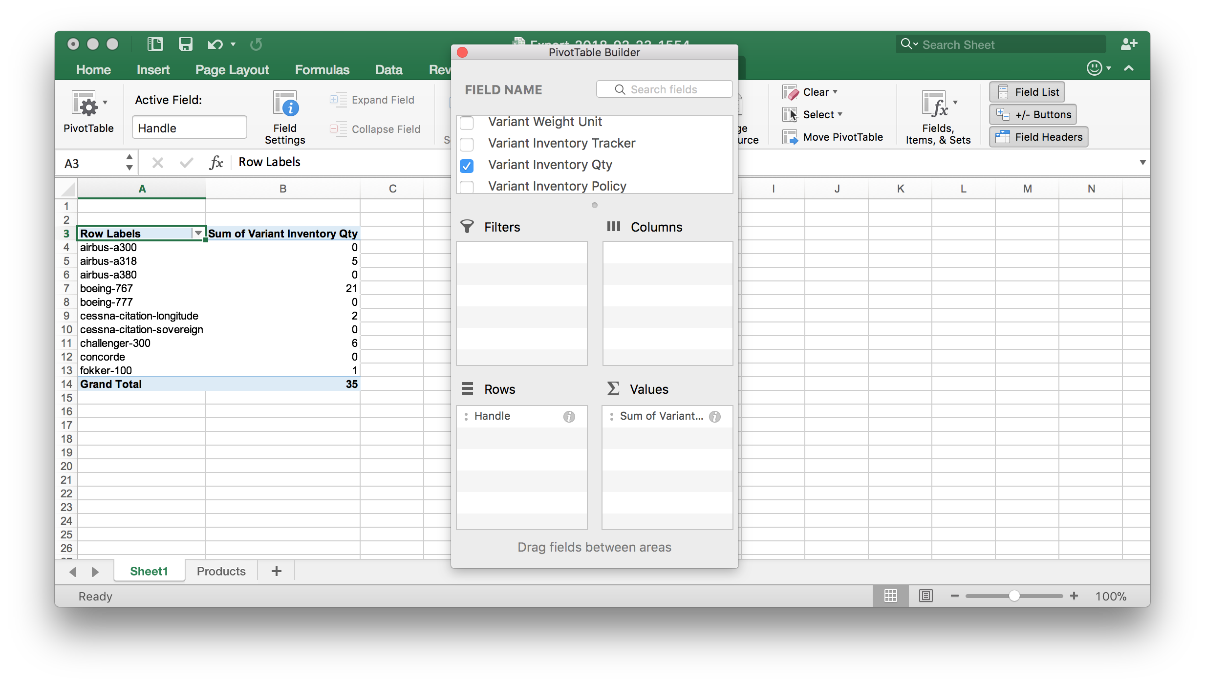 Drag and Drop field Handle to the Rows, field Variant Inventory Qty to the Values. Ensure, that there is Sum of Variant… displayed in the Values (this means, that quantities of all Variants for particular Product Handle will be summed up).