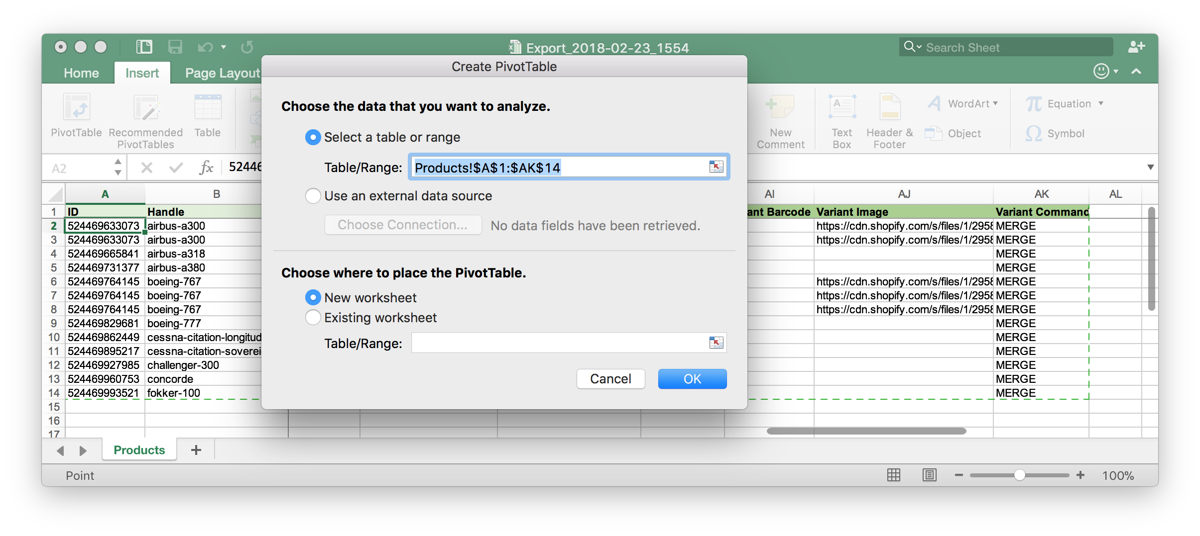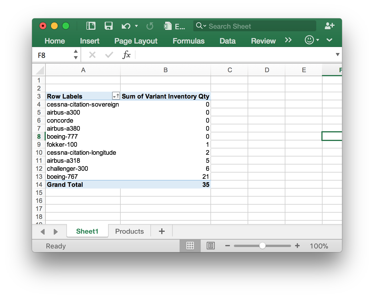 You can create new Excel file. It should have only 2 columns: Handle and Published. Copy Handles of all products with Sum of Variants Inventory Qty that have 0 from the Pivot Table into column Handles. Put FALSE value for all products in the column Published. Remeber to name the Sheet Products.