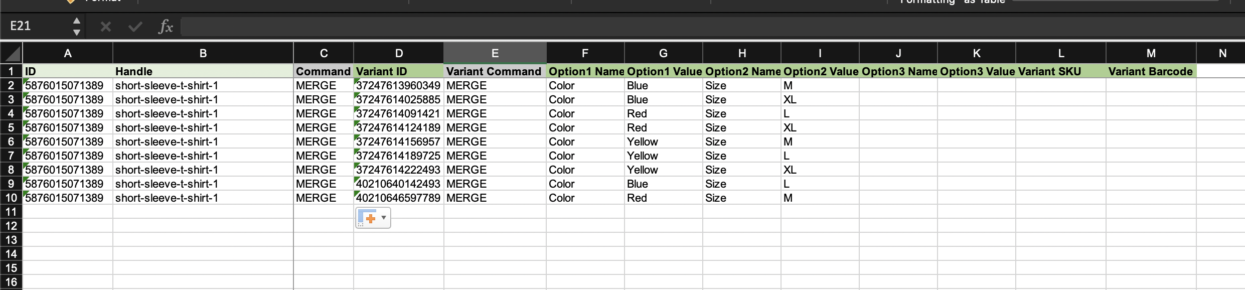 The only thing you need to change in the Exported file is the Variant Command. This column tells the app specifically what to do with the product variants, not the product as a whole. Read more about Variant Command column values, and what can you do with them.