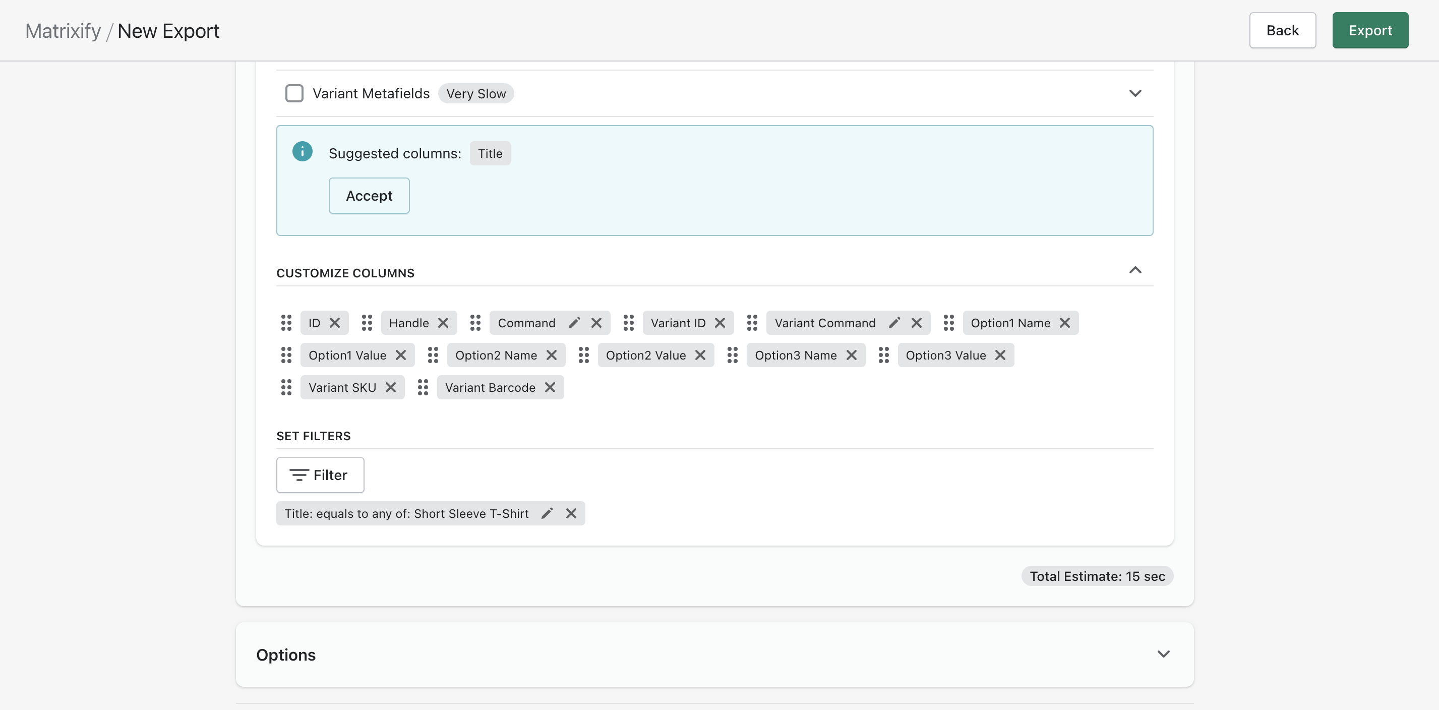 If you do not need to delete variants for all Products, you can apply filters to Export only the Products that you need. As an example, we have added the filter “Title” set to “equals to any of” to Export only the Product “Short Sleeve T-Shirt”.