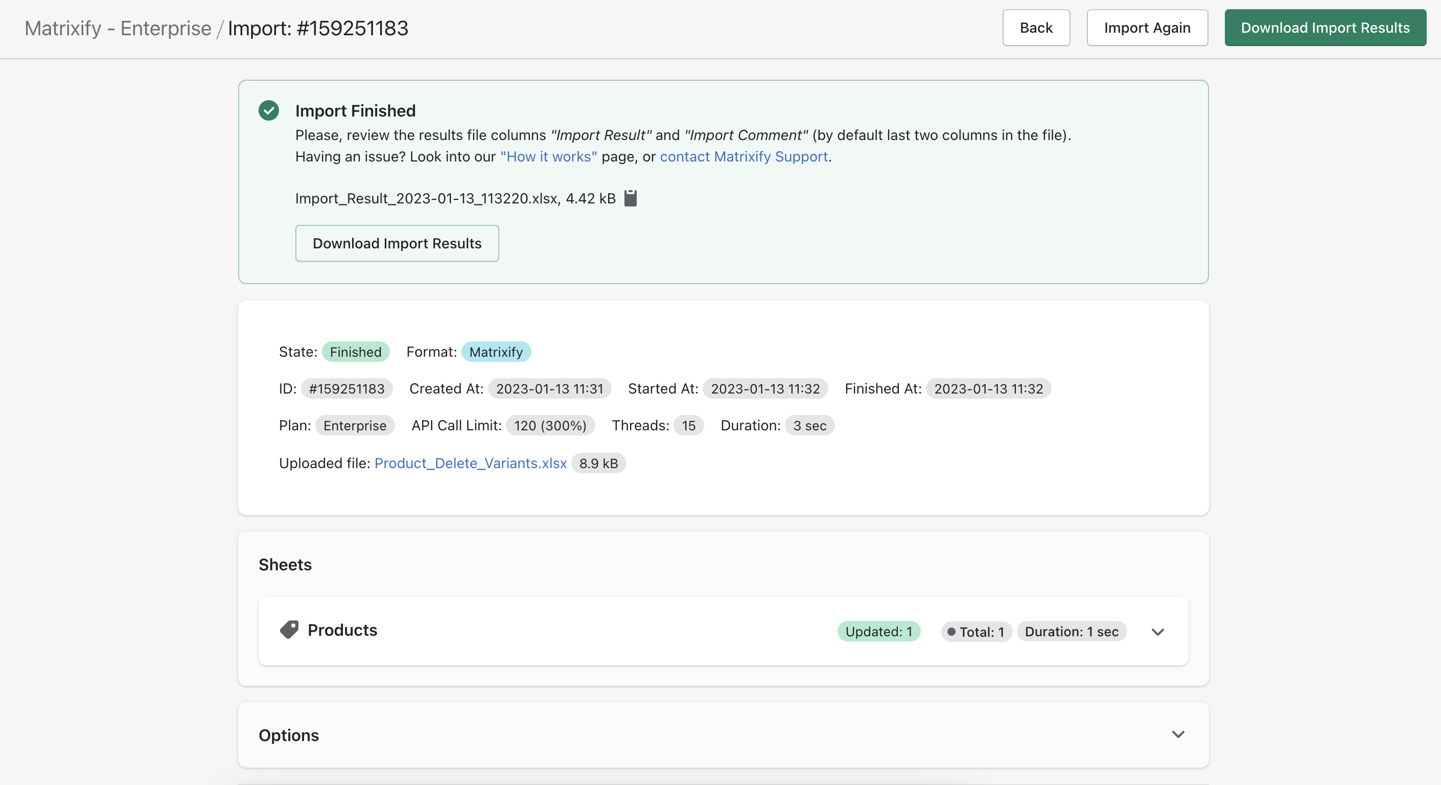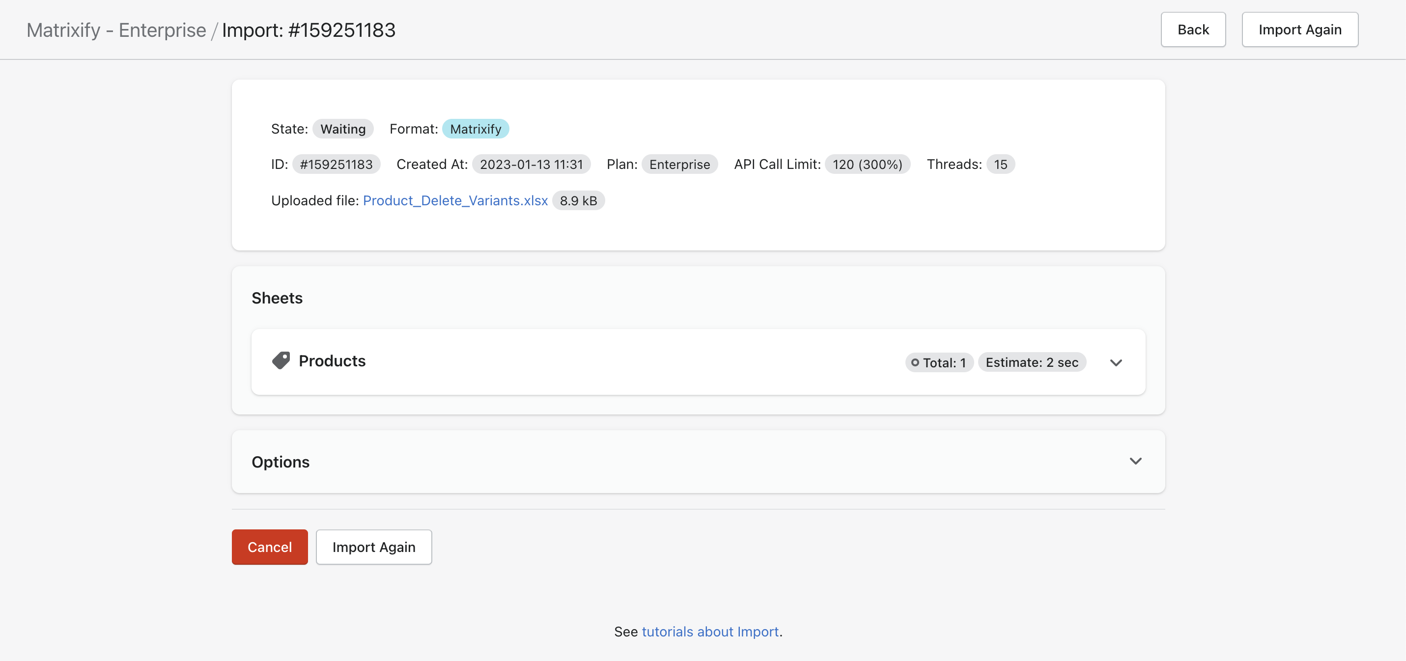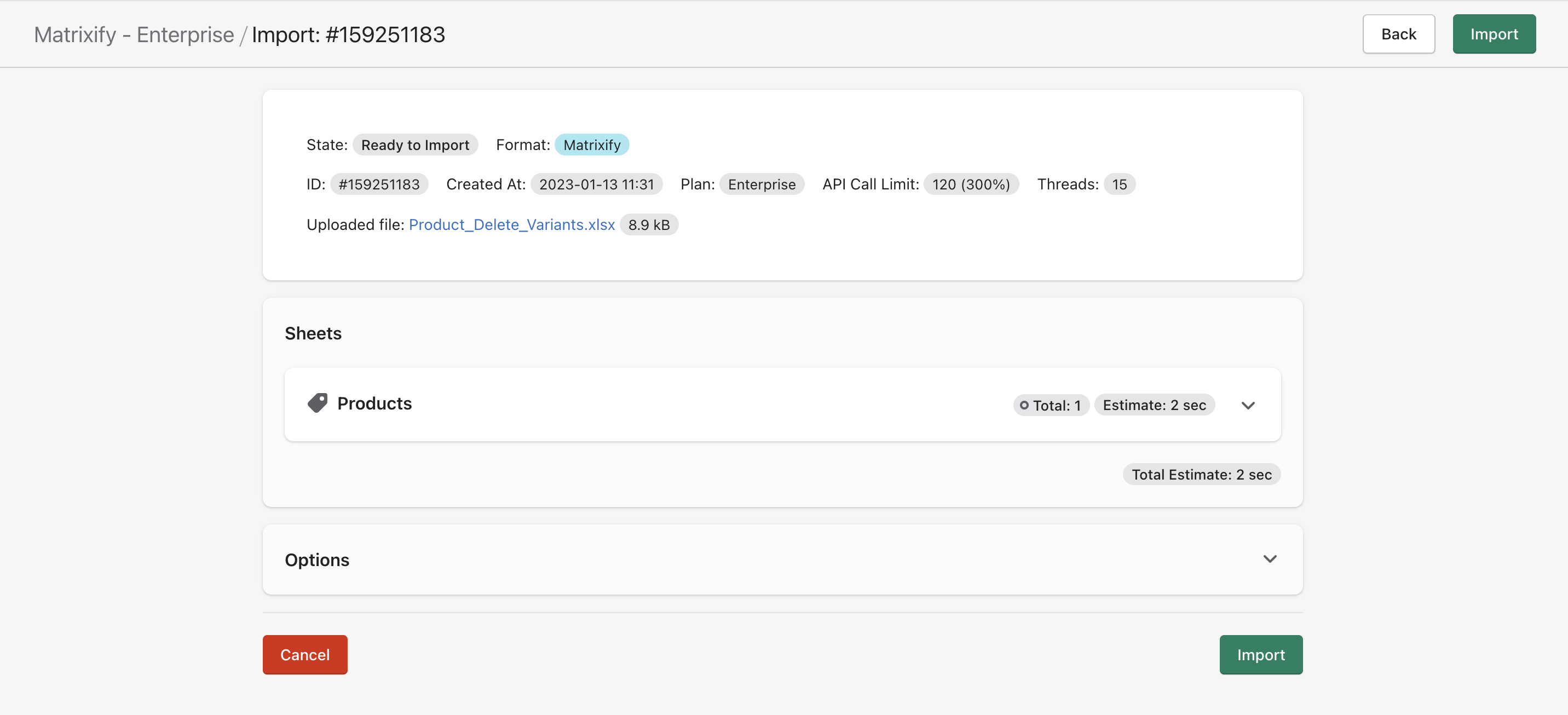 If you change your mind about something, you can press the “Cancel” button to cancel the import job, and start over. Thus far imported Products will already have had their Variants deleted. Also, when canceling the import job, Matrixify generates the Import Results file for you anyway for the items that were imported before canceling.