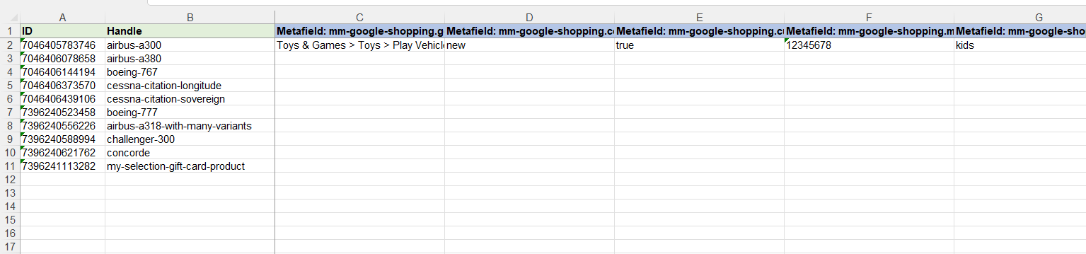 mm-google-shoppingnamespace. - In the exported file, update Metafield columns for your products.