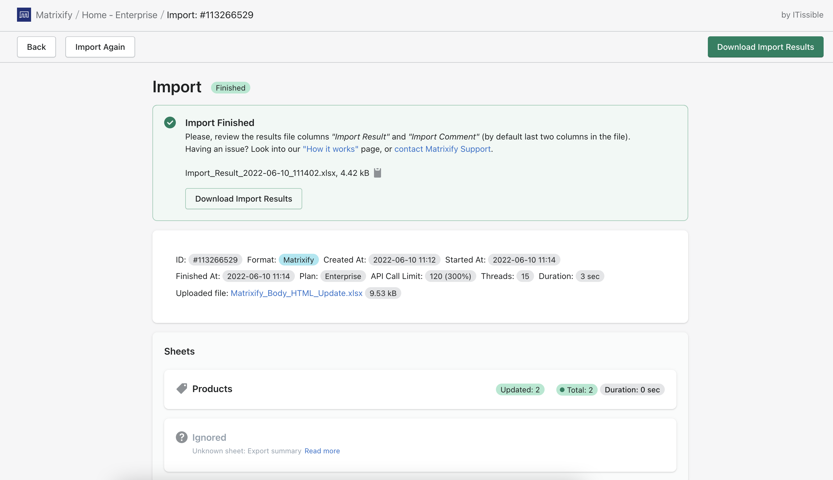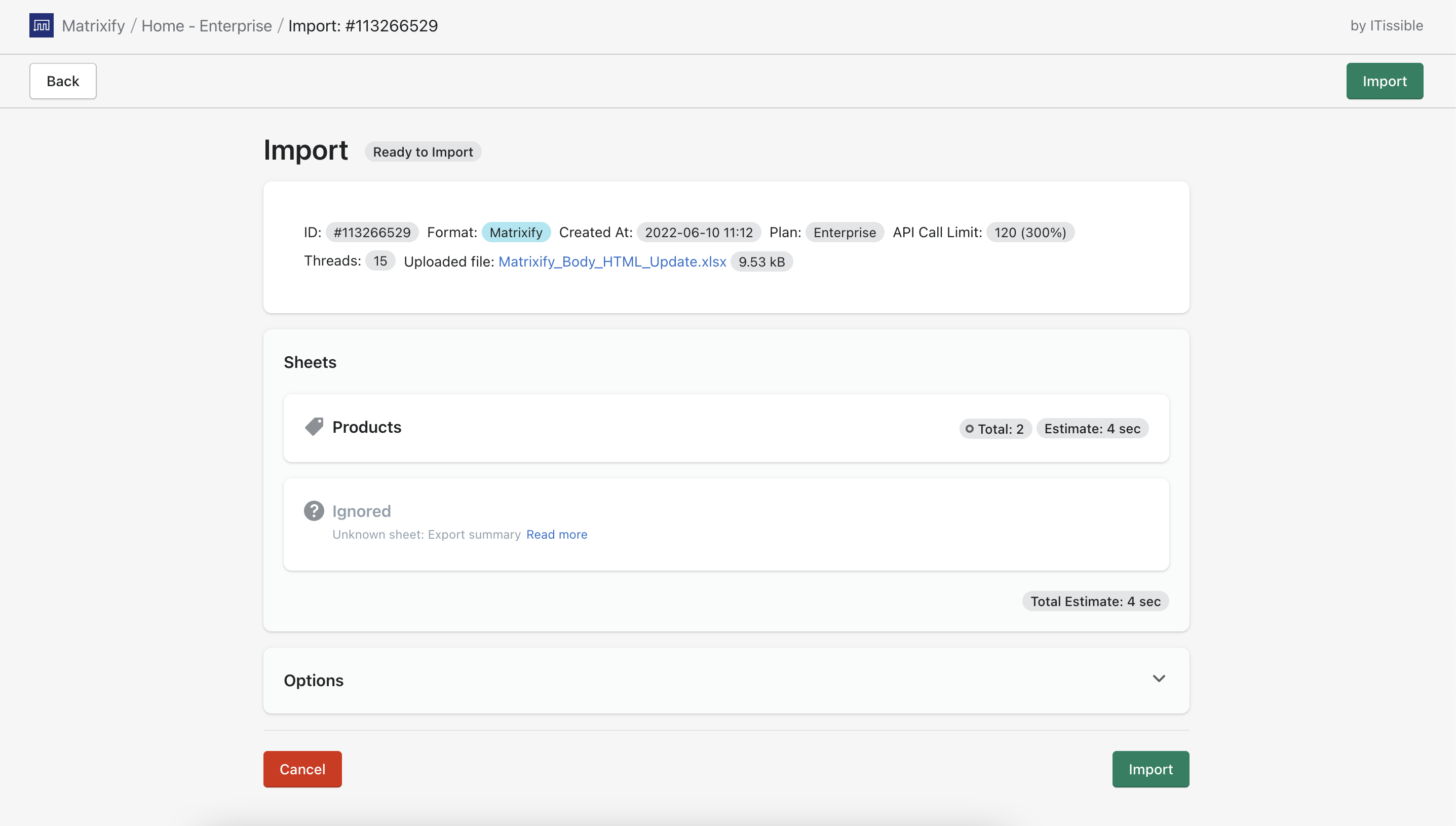 Also, when canceling the import job, Matrixify will still generate the Import Results file for you for the items that were imported before canceling.