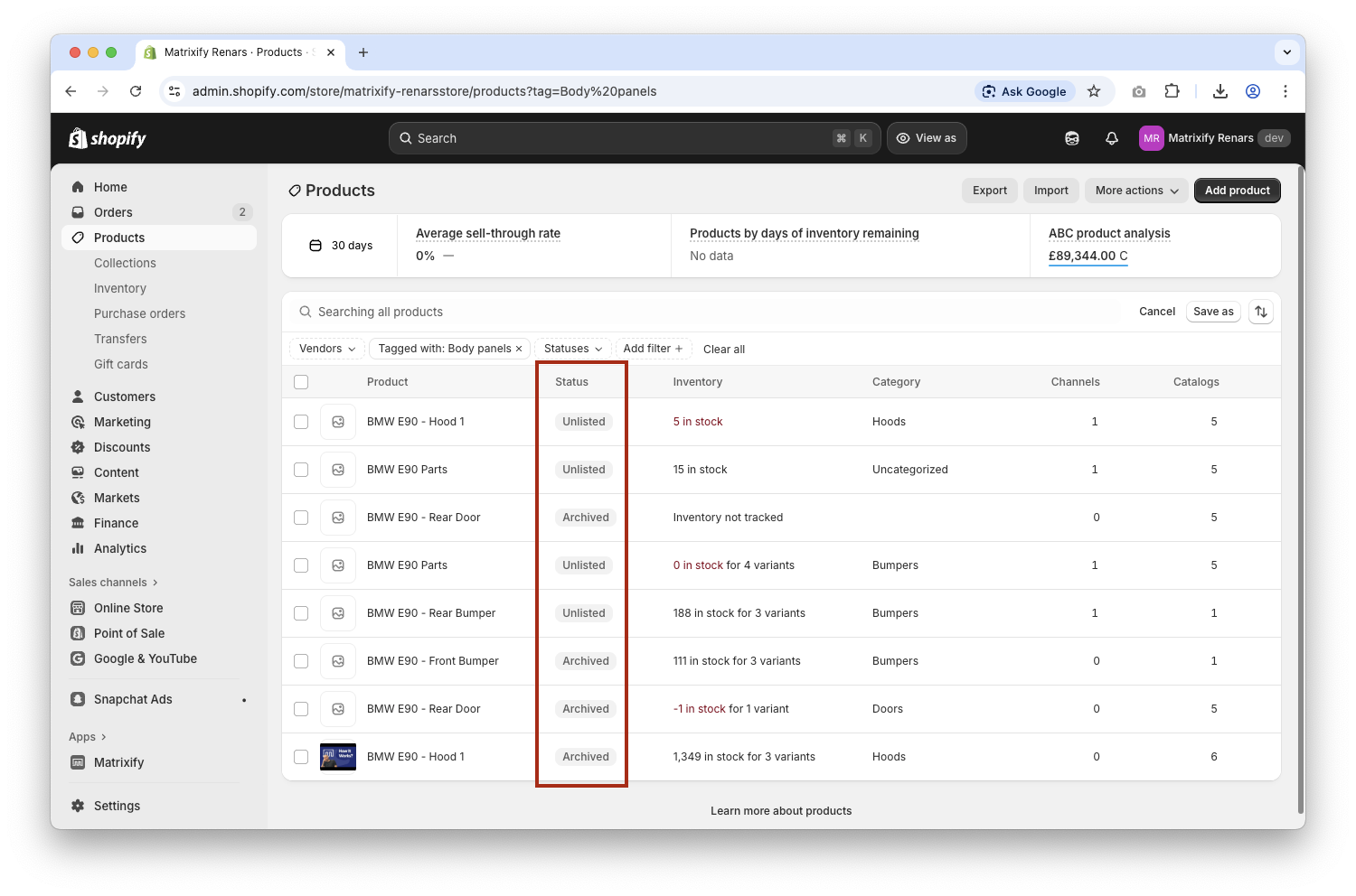 - Export your Shopify Products with their current status value using the Matrixify app.
