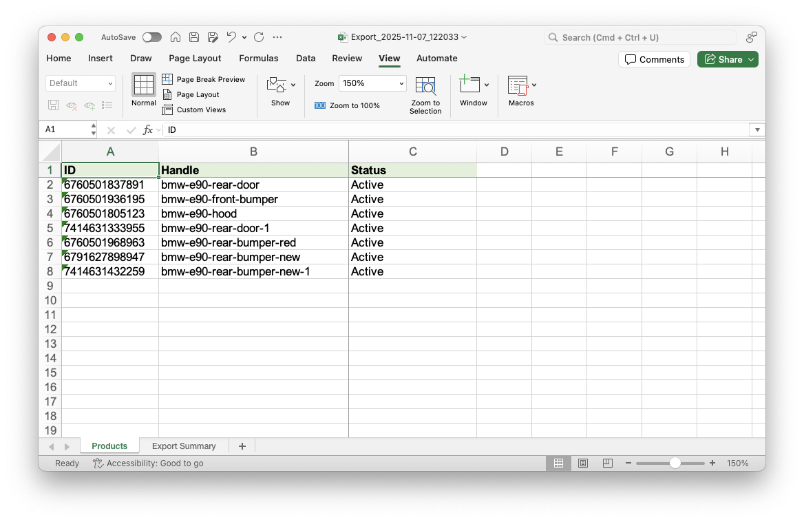 - Export your Shopify Products with their current status value using the Matrixify app.