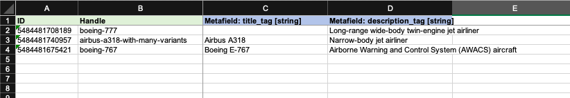 We will also need something to identify which Products these Metafields are for, this means that we will need the “ID” and “Handle” columns too. You can go ahead and delete any other Basic columns in the file. At this point your file should look like this: