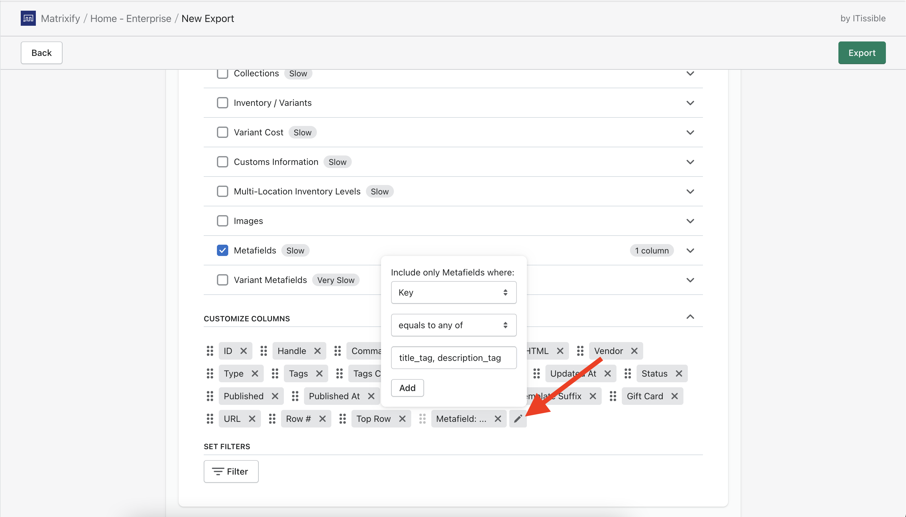 If you have many Metafields, then in the “Customise Columns” tab – you can edit the “Metafields” column placeholder to include only the SEO Metafield columns. In that case, choose to “Include only Metafields where Key equals to any of: title_tag, description_tag“.