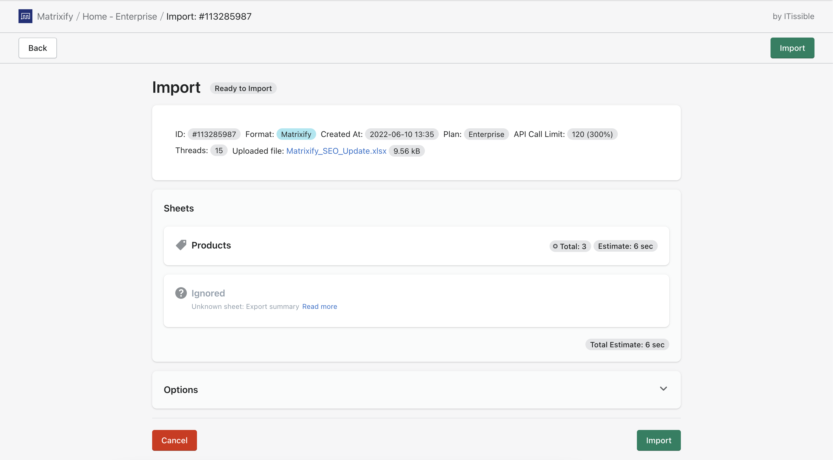 If you change your mind about something, you can press the “Cancel” button to cancel the import job, and start over. Thus far imported Products will already have the updated SEO Metafields in your Shopify store. Also, when canceling the import job, Matrixify will still generate the Import Results file for you for the items that were imported before canceling.