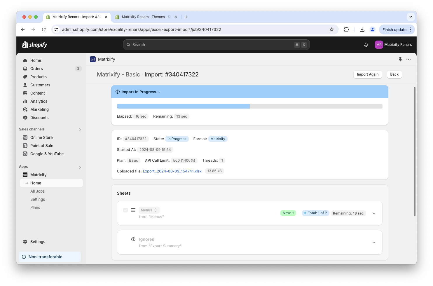Once the export has finished, download the file and head into the Matrixify app in your new Shopify store.