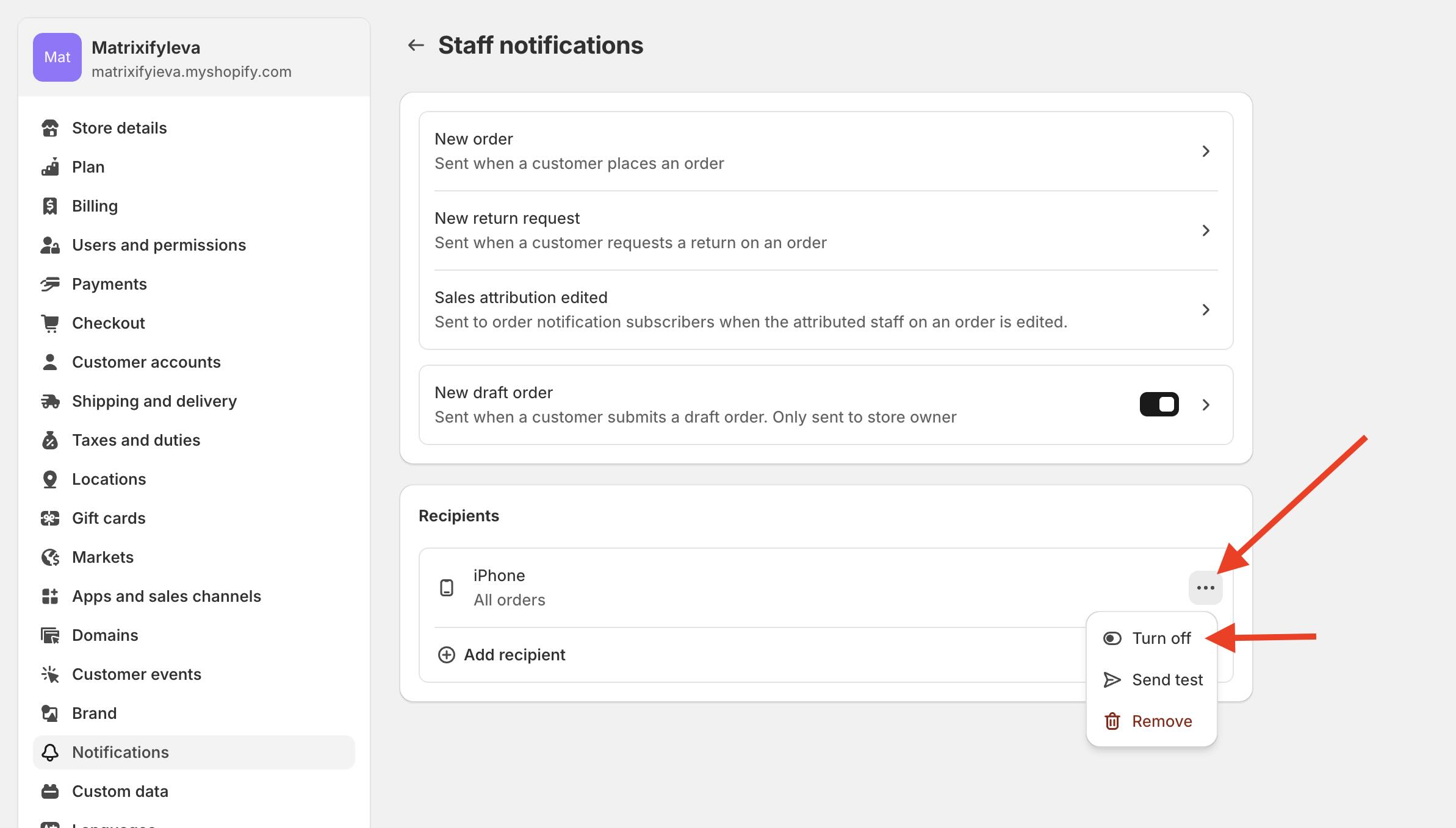 Under “Recipients” you can “Turn off” notifications to any of the recipients by clicking on the three dot icon and then clicking “Turn off”. You can then switch the notifications back on after your Orders have been migrated.