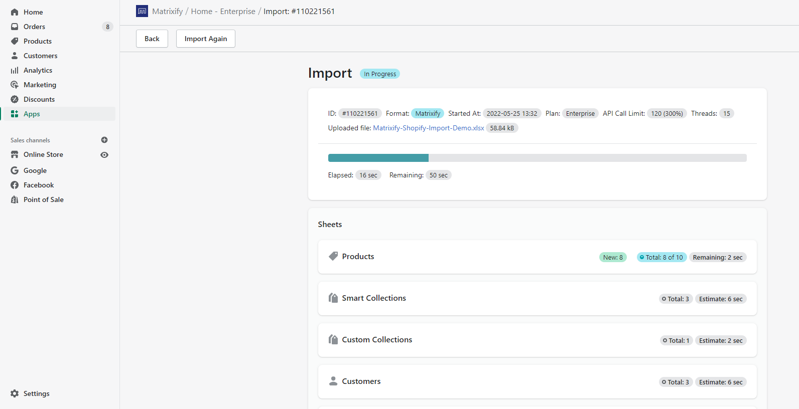 Just go to your new Shopify store, install the Matrixify app, and in the Import section of the app upload your previously exported file.