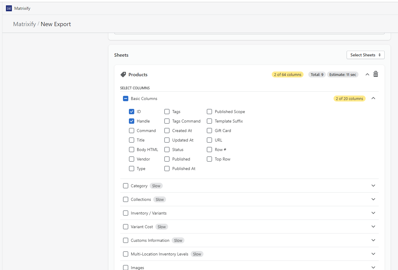 Open Basic Columns group and select to export only “ID” and “Handle” columns.