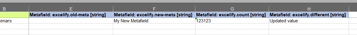 - In the exported file add the new Metafield columns that follow template – “Metafield: namespace.key [string]”, in example, “Metafield: excelify.my-metafield [string]”