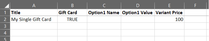 - Option1 Name and Option1 Value – for a product without variants, these columns can stay empty. If all your gift card products will be without variants then you do not need to have these two columns at all.