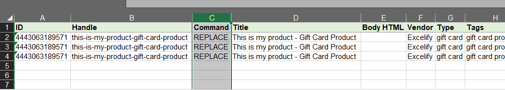 - Command – set to the value “REPLACE” in all rows for the product