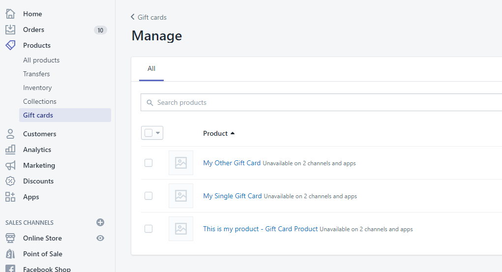 Go to Shopify Admin -> Products -> Gift Cards in your Shopify Admin.