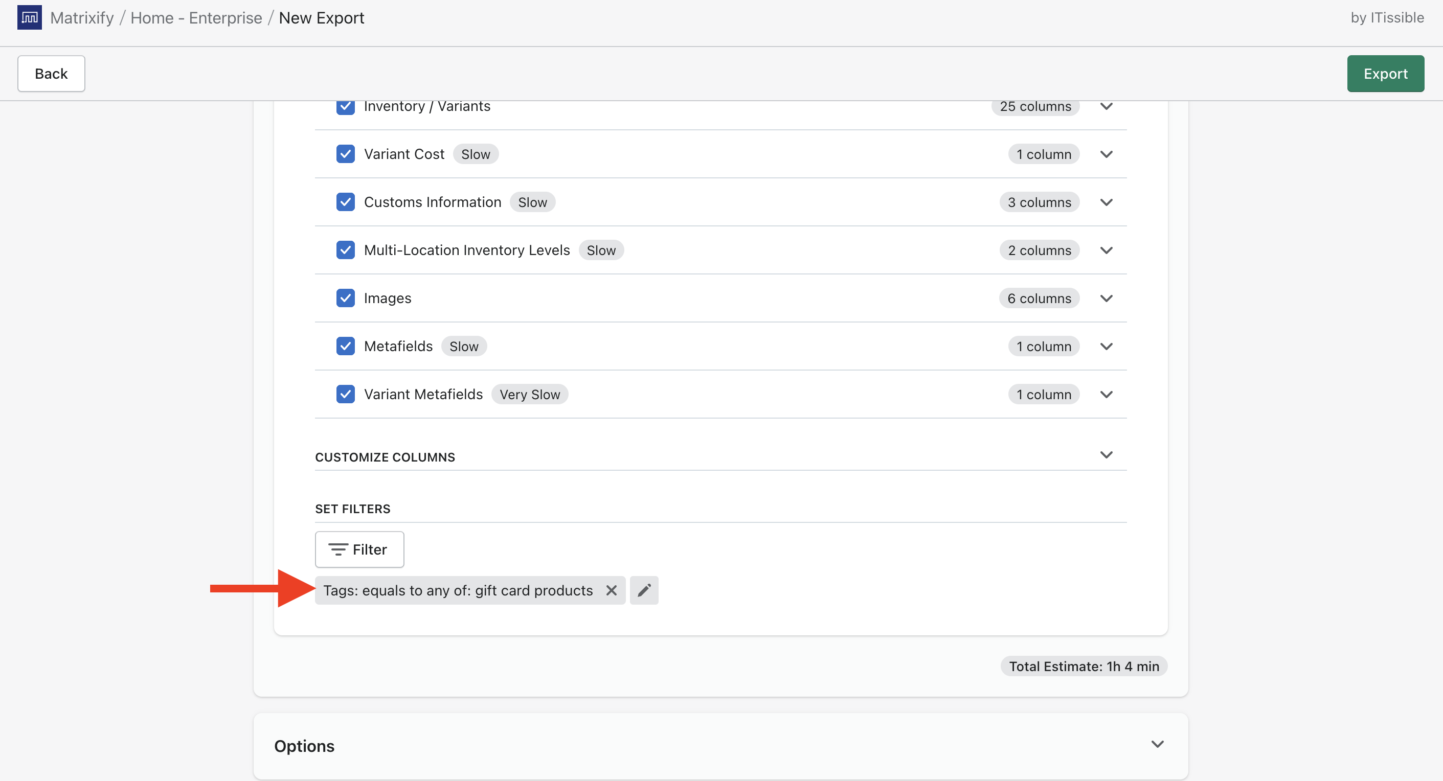You can also click on the “Filter” button to apply filters and export only specific Products that you wish to change to Gift Card Products in Shopify.