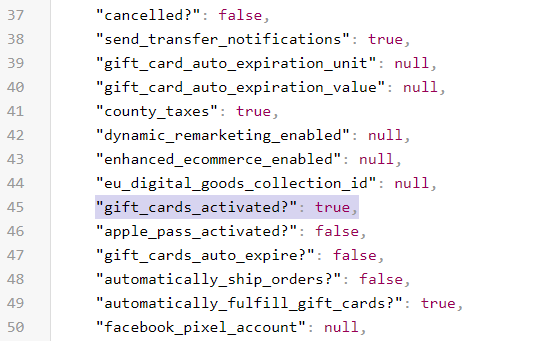 For more technical users – you can check if Gift Cards have been activated by checking the shop_settings.json in your store admin.