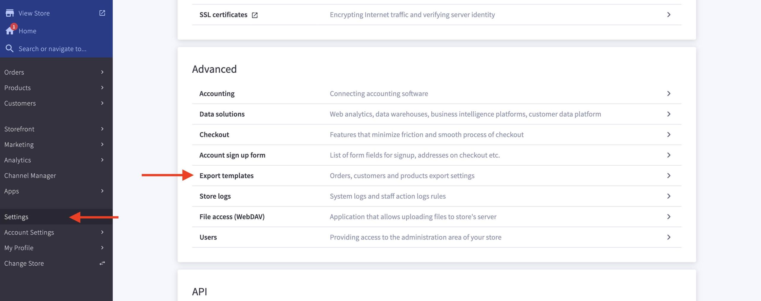 In your BigCommerce admin, go into Settings -> Export Templates.