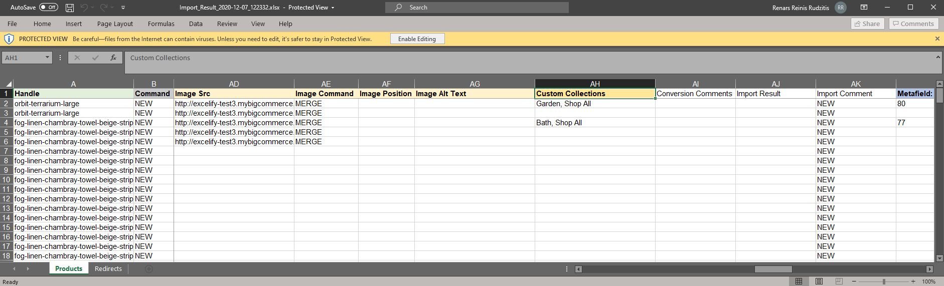 - If in the file, Products sheet, you are updating Product Handles, make sure to also update Redirects sheet -> Target column and Custom Collections -> Product: Handle column.